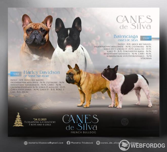 Naše chovatelská stanice Canes de Silva nabízí štěňátka Francouzského buldočka s PP FCI, narozená 24.12.2025. Štěňátka jsou po výstavních, zdravotně i geneticky testovaných rodičích, oba rodiče mají také DNA profil. Máme jednoho chlapečka a tři holčičky, všichni jsou buď žíhaní nebo strakoš-žíhaní, viz.foto. Návštěvy jsou po dohodě vítány. Odběr možný na konci února. Při odběru budou pejsci naočkováni, 3 x odčerveni a očipováni. Kupní smlouva a velká výbava samozřejmostí.